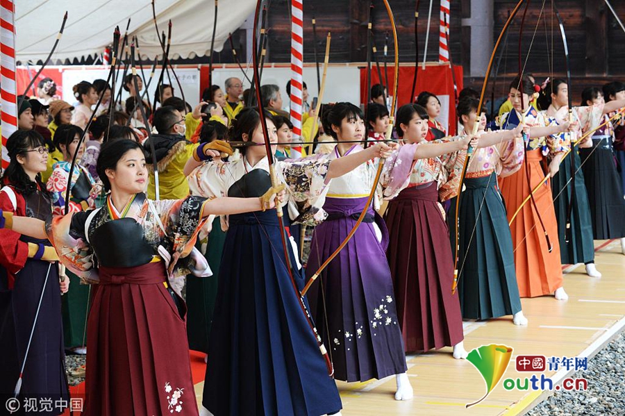 日本京都女性穿和服射箭庆祝成年