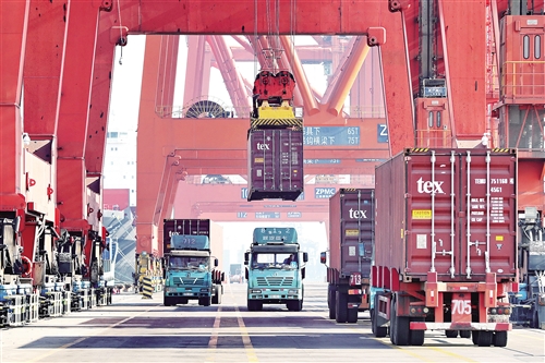 一月十三日,工人在唐山港京唐港区集装箱码头操作机械设备往轮船上吊装集装箱。 新华社记者 杨世尧摄