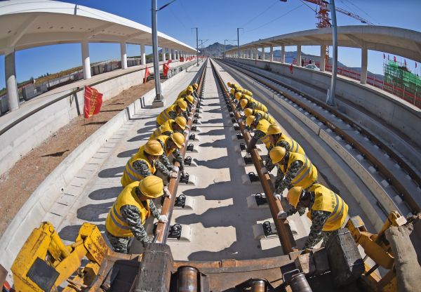 资料图片:中铁十九局工程人员在京沈高铁凌源南站进行铺轨作业(2017年9月28日摄)。新华社记者 杨青 摄