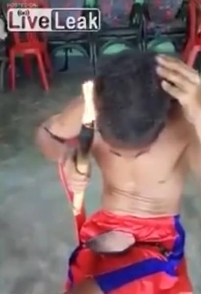 该视频中,这位身穿红蓝短裤、上身赤裸的男子也运用了类似的方法。头发本就不长的男子先是将镜子放在腿上以便照着看,然后手持一根顶端燃着的木条围着头顶理发。结束后,竟没有一丝一毫的烧伤或是不适,令人倍感惊奇。