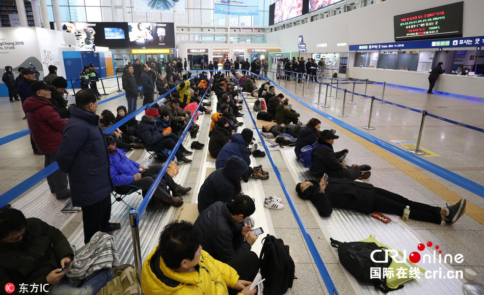 当地时间2018年1月15日,韩国首尔火车站,民众席地而坐等待购买春运车票,不少人通宵排队买票。根据线路不同,韩国春运车票分别于16日和17日上午9点开售。据悉,韩国和中国的春运情形一样,春节前也是火车票和机票一票难求。 据悉,韩国和中国的春运情形一样,春节前也是火车票和机票一票难求。 图片来源:东方IC