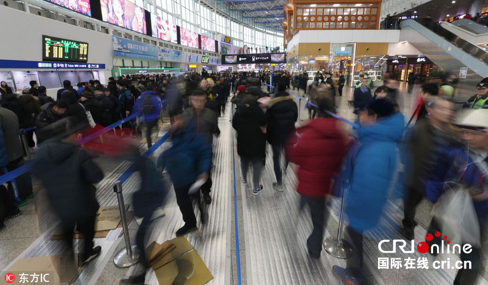 当地时间2018年1月15日,韩国首尔火车站,民众席地而坐等待购买春运车票,不少人通宵排队买票。根据线路不同,韩国春运车票分别于16日和17日上午9点开售。据悉,韩国和中国的春运情形一样,春节前也是火车票和机票一票难求。 据悉,韩国和中国的春运情形一样,春节前也是火车票和机票一票难求。 图片来源:东方IC
