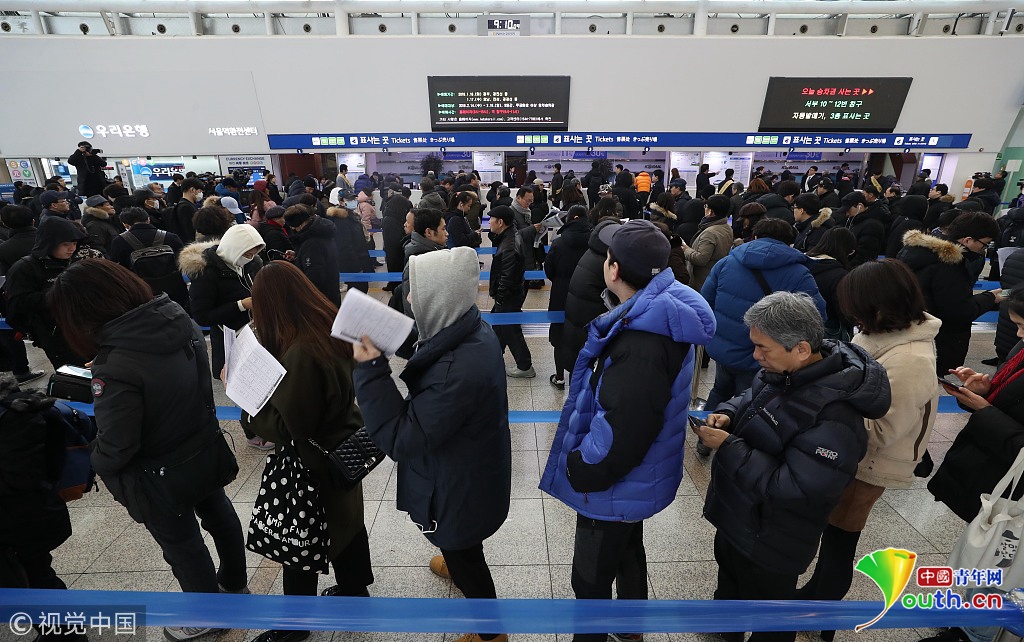 2018年1月16日讯,韩国首尔,韩国“春运”火车票预售开始,首尔火车站人山人海,民众排队购买火车票场面火爆,不少人通宵排队买票。根据线路不同,韩国“春运”车票分别于16日和17日上午9点开售。据悉,韩国和中国的春运情形一样,春节前也是火车票和机票一票难求。图片作者:Yonhap News Agency/视觉中国