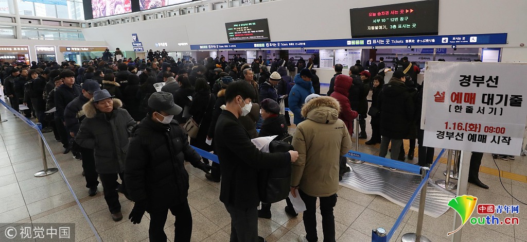 2018年1月16日讯,韩国首尔,韩国“春运”火车票预售开始,首尔火车站人山人海,民众排队购买火车票场面火爆,不少人通宵排队买票。根据线路不同,韩国“春运”车票分别于16日和17日上午9点开售。据悉,韩国和中国的春运情形一样,春节前也是火车票和机票一票难求。图片作者:Yonhap News Agency/视觉中国