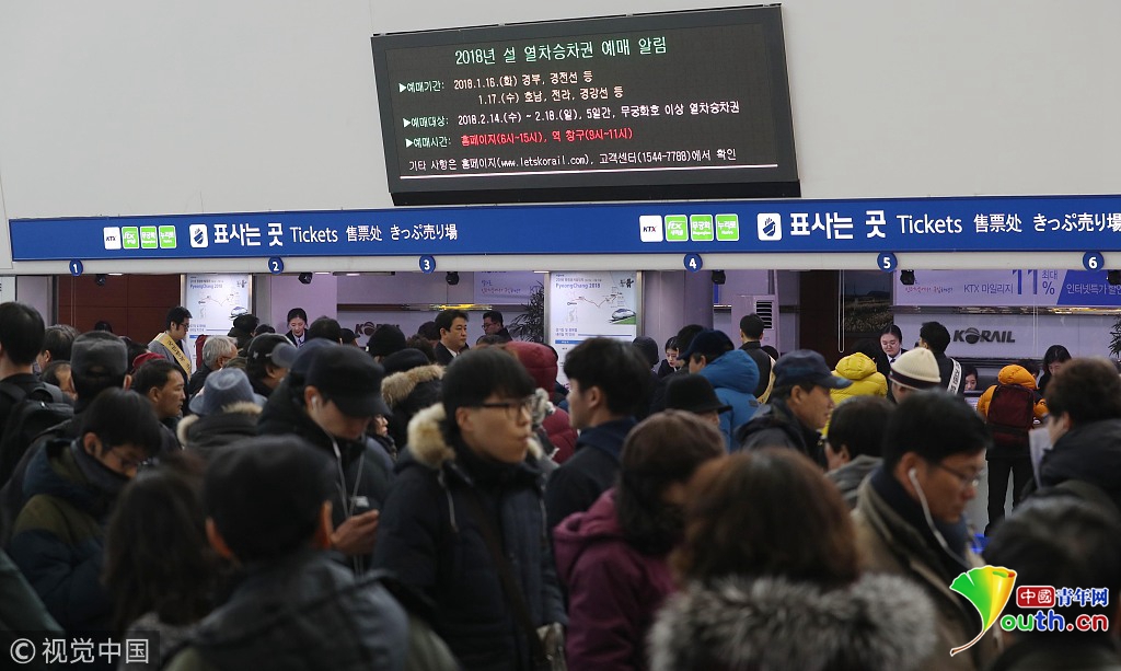 2018年1月16日讯,韩国首尔,韩国“春运”火车票预售开始,首尔火车站人山人海,民众排队购买火车票场面火爆,不少人通宵排队买票。根据线路不同,韩国“春运”车票分别于16日和17日上午9点开售。据悉,韩国和中国的春运情形一样,春节前也是火车票和机票一票难求。图片作者:Yonhap News Agency/视觉中国