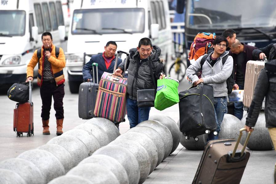 一批旅客手提行李箱纷纷从石球上方越过。这些石球在这里已经摆放了一段时间,对广场内的秩序维护起到了很明显的效果。管理人员称石球的设置减少了大概八成的无关车辆进入广场,对管理工作也带来便利。