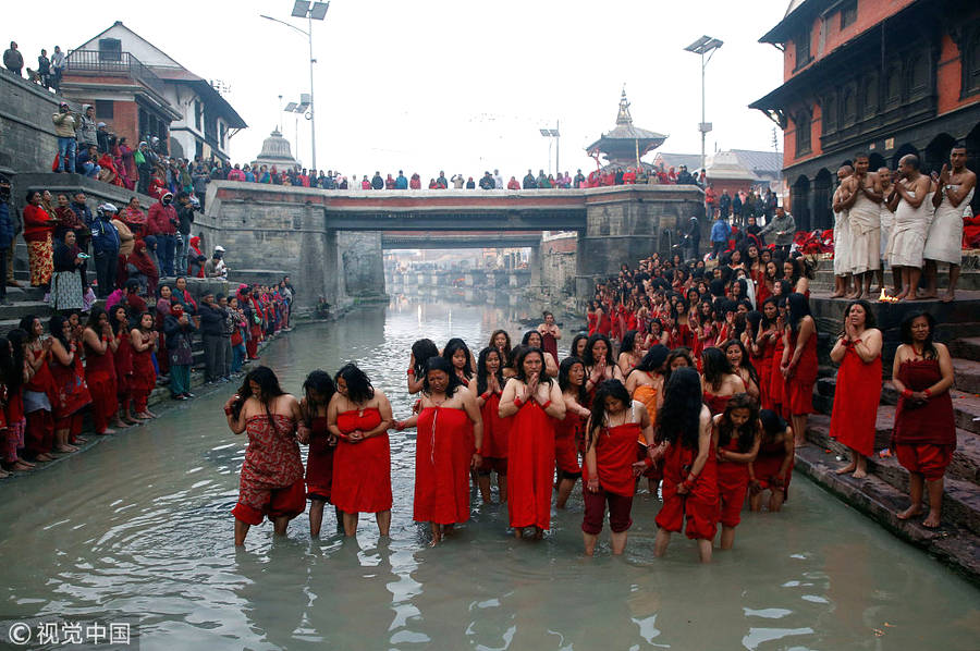 当地时间2018年1月16日,尼泊尔加德满都,虔诚的信徒庆祝传统节日Swasthani Bratakatha,妇女在河中圣浴,为丈夫祈福祷告。图片作者:NAVESH CHITRAKAR/视觉中国