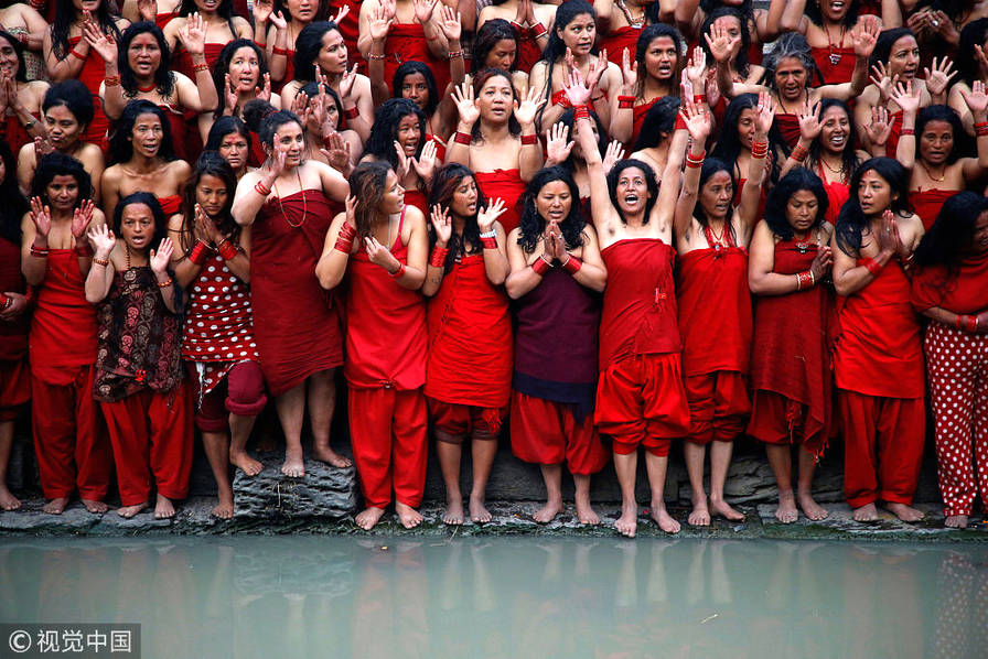 尼泊尔妇女河中集体圣浴 为丈夫祈福