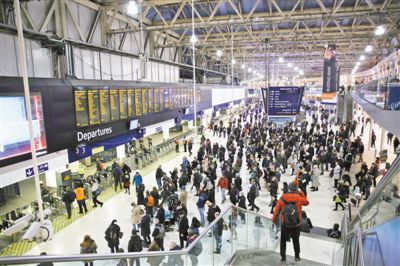 1月8日,伦敦多条铁路线员工举行罢工。图为伦敦滑铁卢火车站内,许多乘客在查看信息。记者 强薇摄
