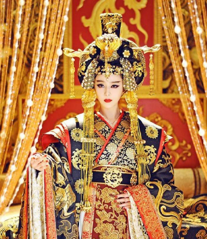范冰冰近两年的作品《武媚娘》《赢天下》中都有十分华丽的头饰造型。看起来十分奢华,有的网友调侃,看着就脖子痛!