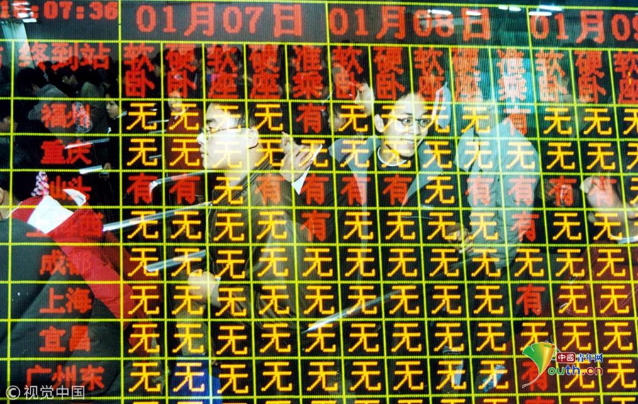 2004年1月7日是春运第一天,武汉各高校学生和进城民工开始纷纷返乡。武汉火车站内公告牌显示:到广州、上海、重庆的车票已告售罄。