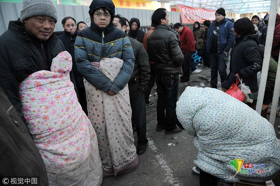 2011年1月17日,在原杭州汽车东站春运火车票大卖场,来自湖南常德的牟师傅(左一)和两名工友,裹着棉被,在寒风中等待买票回家。