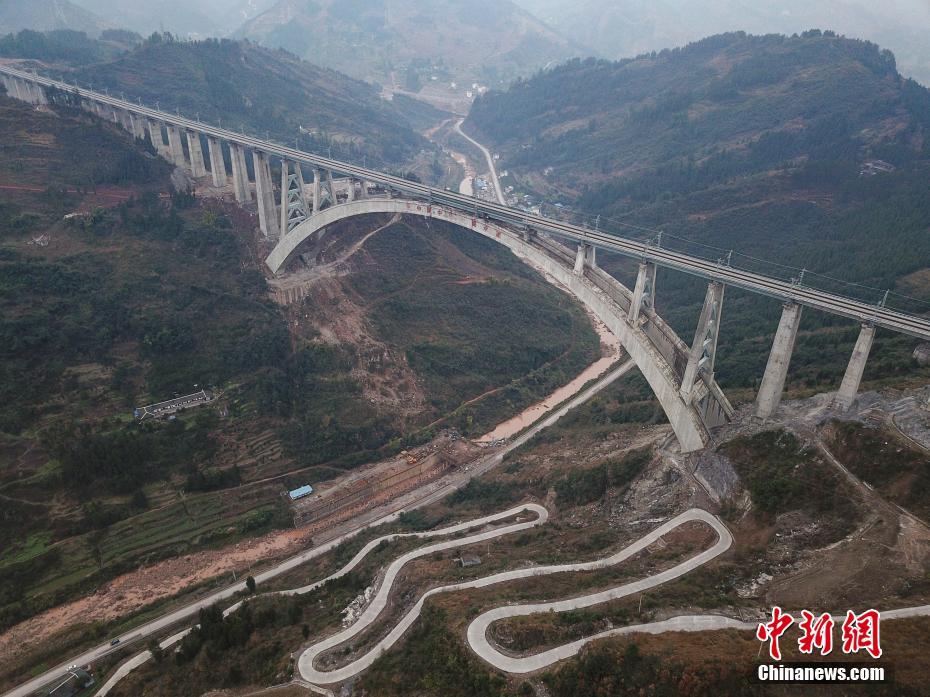 1月16日,航拍渝贵铁路夜郎河特大桥。