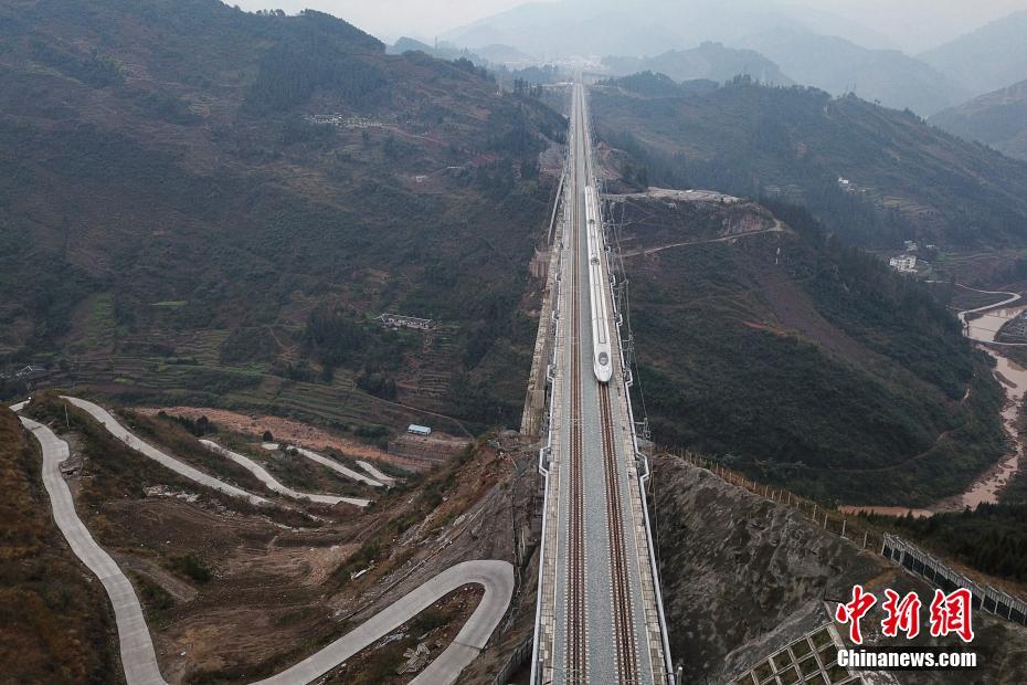 1月16日,一列动车从渝贵铁路夜郎河特大桥桥面驶过。