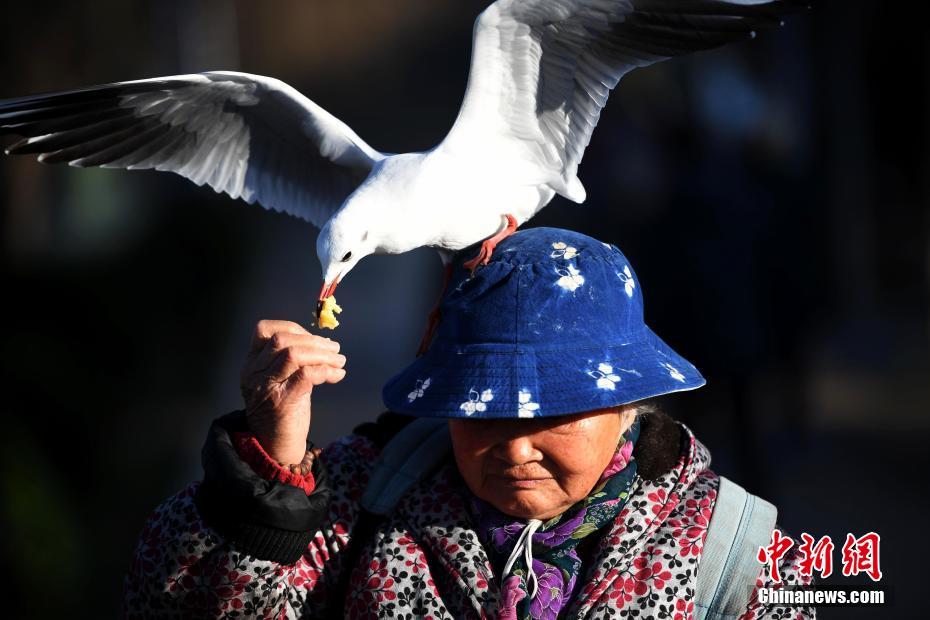 昆明大观公园里“海鸥奶奶”在给红嘴鸥喂食。李进红 摄