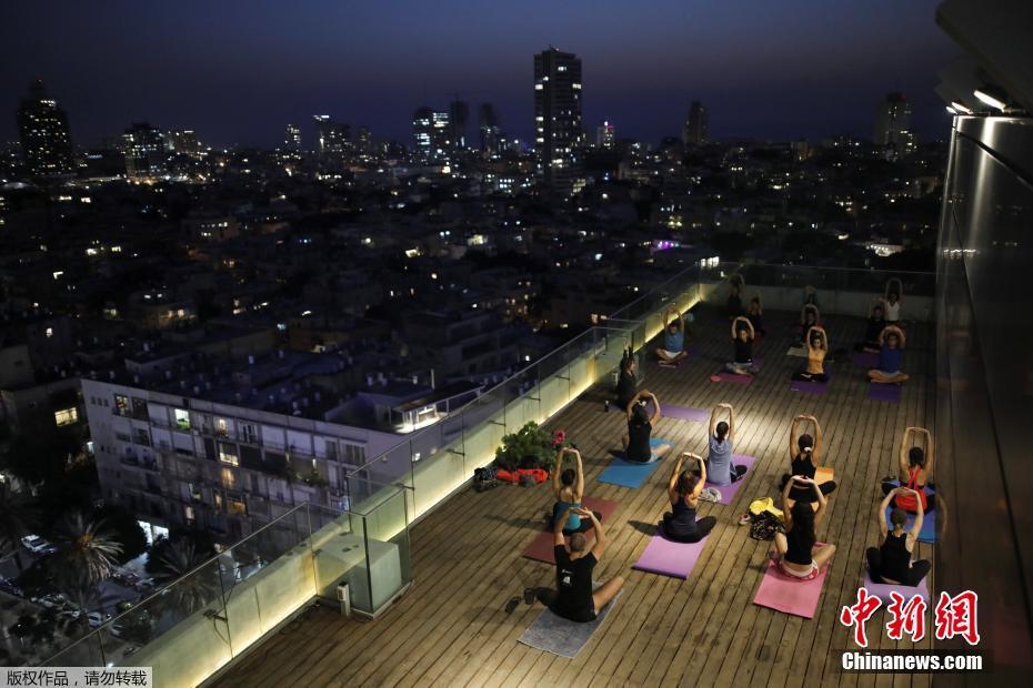 当地时间2017年10月19日,以色列特拉维夫,民众在屋顶练习瑜伽。