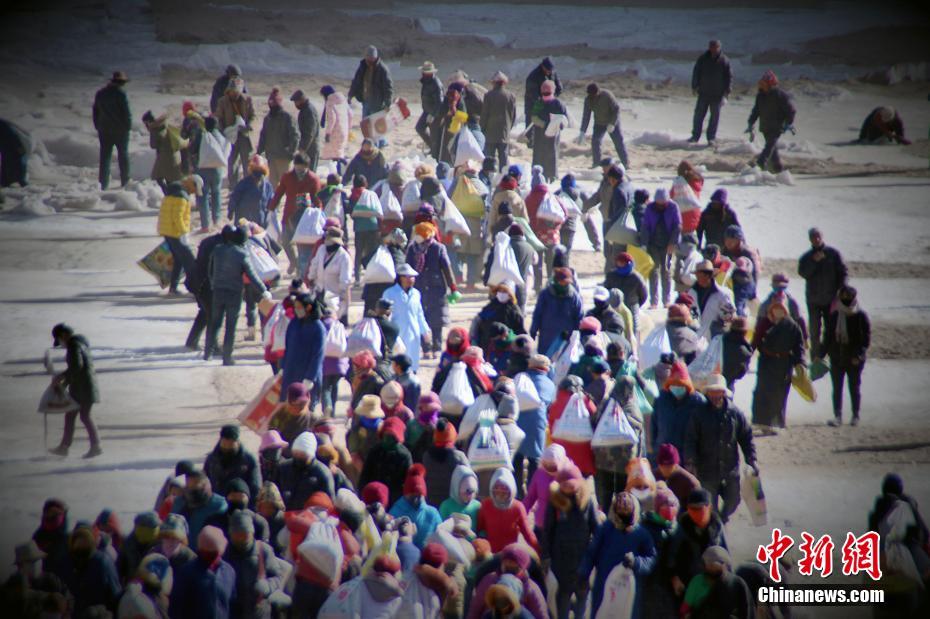 自1月15日起,青海省玉树藏族自治州称多县通天河流域藏族民众依当地传统,以沙为墨冰为纸,在冰封的通天河面书写巨大的“六字真言”,并将此称之为“经桥”,以祈福世界和平。图为青海省称多县称文镇附近藏族民众在通天河畔取沙,用于绘写“经桥”。 更尕 摄