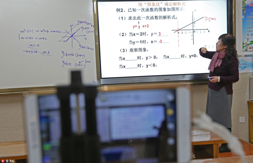 2018年1月17日,受雾霾重污染影响,西安市中小学幼儿园全部停课,不少学校教师通过现场讲课网络直播平台,通过直播的形式向在家中的学生们授课。(来源:东方IC)