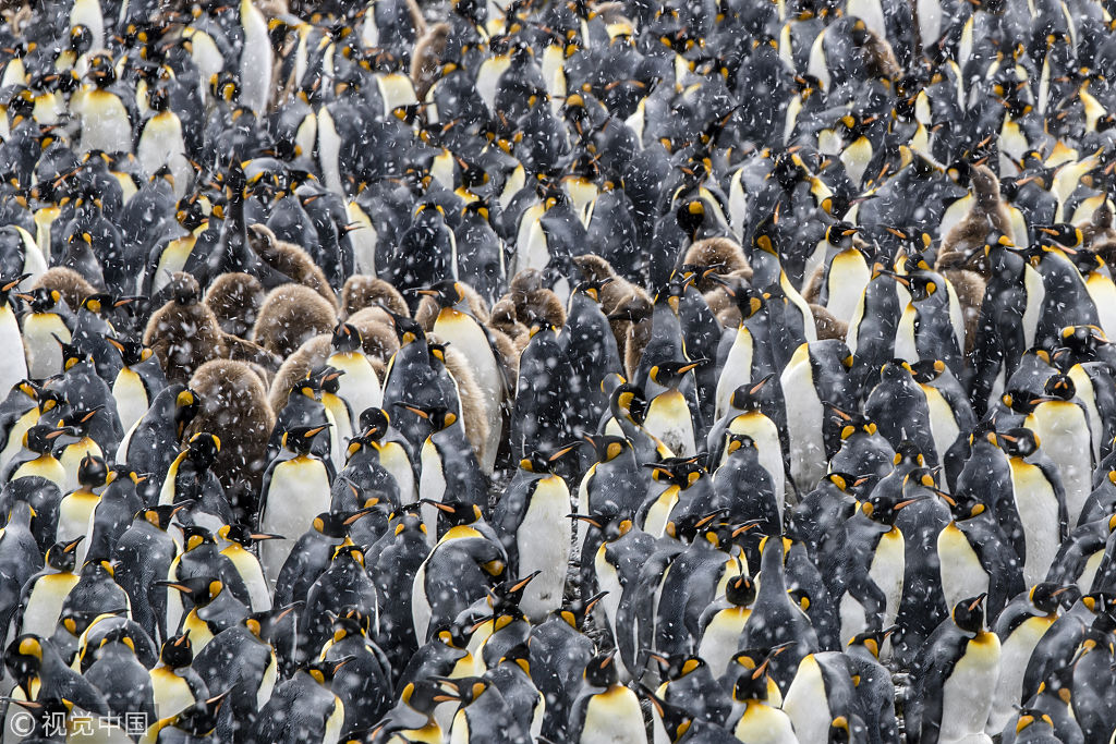 Paul是旅行杂志The Exodus Travels的导游,他在南极南乔治亚岛旅行时邂逅一队企鹅大军,这些家伙在风雪天抱团取暖,身披棕色绒毛的幼崽被成年企鹅层层包围,在飘扬的大雪下组成一幅奇特的画面,宛若精心设计出的智力拼图,看得人眼花缭乱。