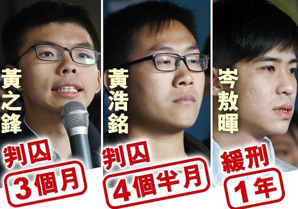 16名被告人包括黄之锋(右)、岑敖晖(左)及黄浩铭(中)等今日判刑。(图片来源:香港东网)