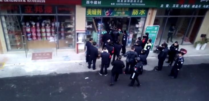 图为男子转窜到一商铺,持刀挟持一名女性,并将玻璃店门锁上后,隔门与警察对峙。