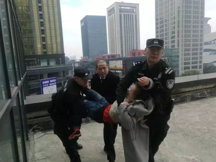 报警人终于一脸尴尬地出现了,他不是什么路人,就是“小黄衣”的同事啊。他说,七八天前,他们在星光大道上发广告,遇到了这个女子。她对其中一个发广告的小伙子一见钟情。就这么几天,碰到了两次。每次一见到,这个女子就自称小铃铛,深情款款地喊那个发广告的小伙子叫“小黄衣”。她说喜欢他爱他,“小黄衣”拒绝了没有用,只好躲着“小铃铛”。据了解,“小铃铛”今年32岁,安徽马鞍山人,和老公一起来杭州打工的,孩子都快十岁了。图为女子是一边哭喊一边挣扎,队员们总算把她四脚朝天地抬到了安全楼梯口。
