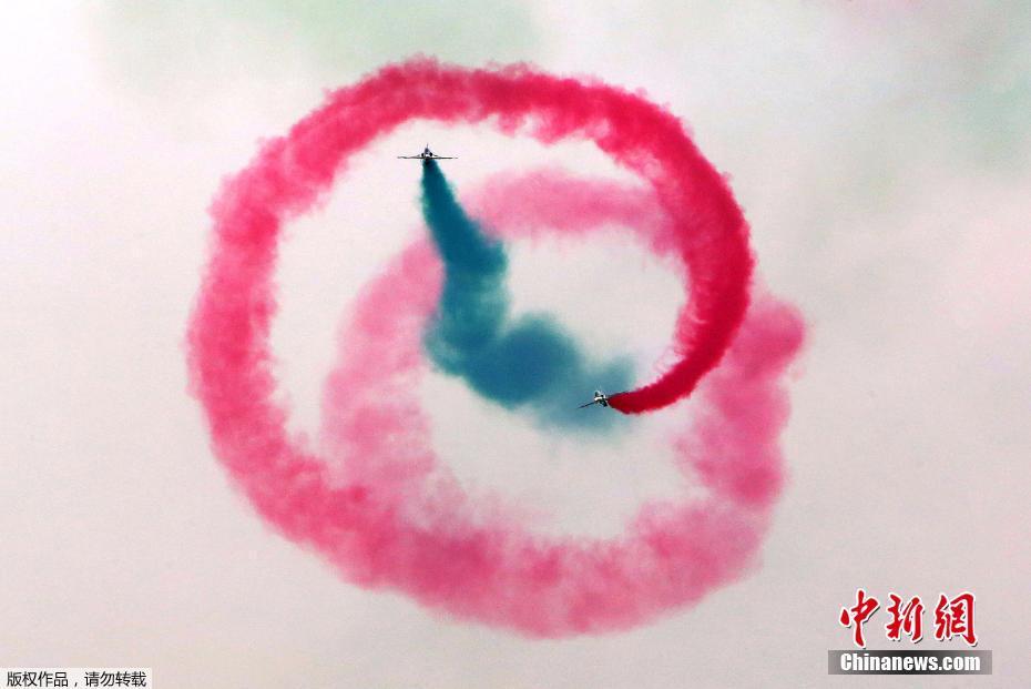 科威特举行航展 “沙特皇家之鹰”表演“一箭穿心”