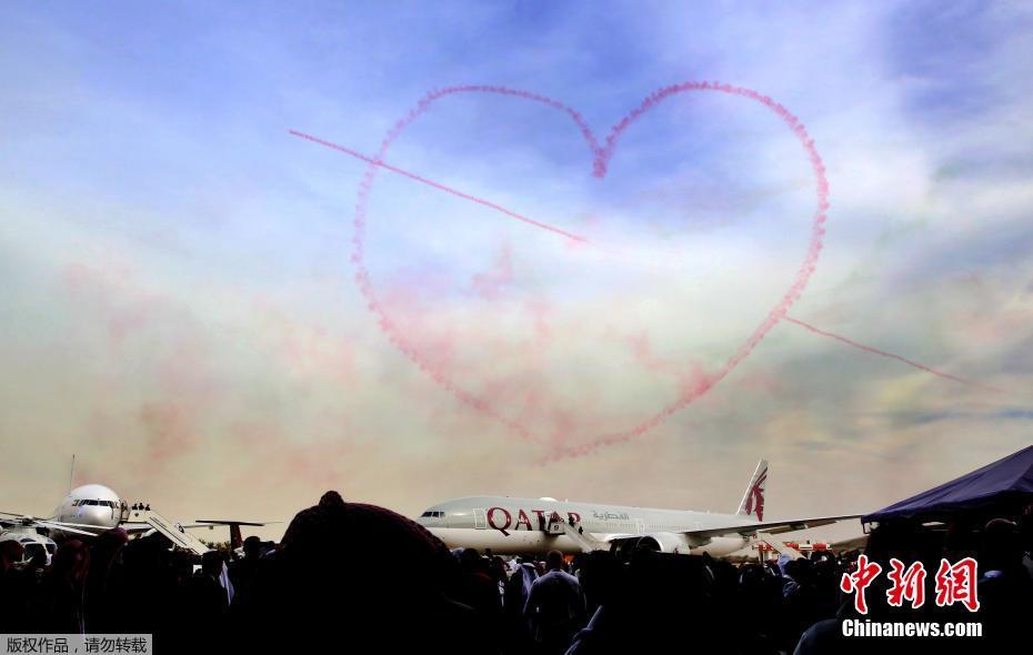 当地时间1月17日,科威特航展举行,沙特阿拉伯王国的“沙特皇家之鹰”特技飞行队上演了“一箭穿心”等多项表演。