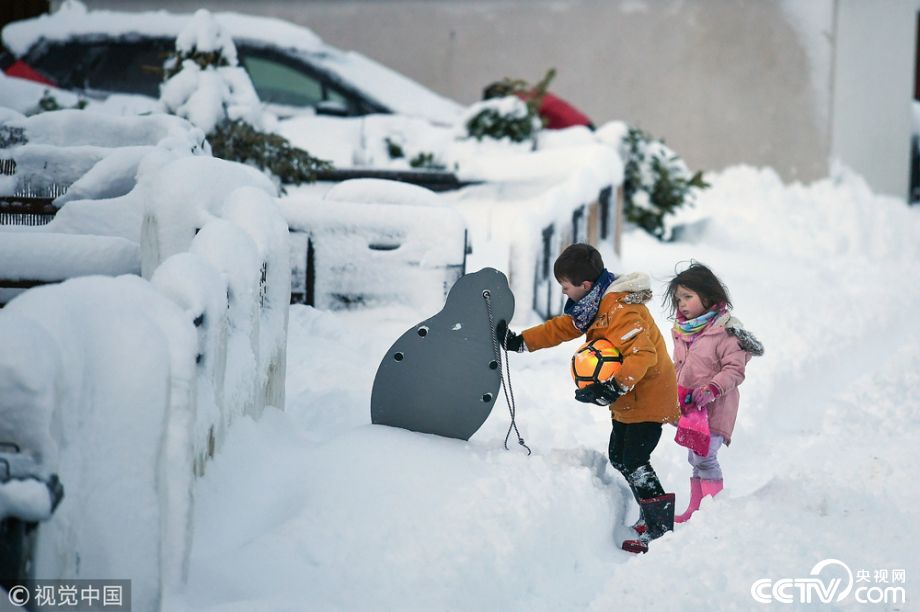 当地时间2018年1月17日,英国,当地遭遇大雪天气,民众出行困难。