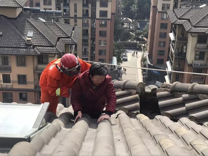 14日上午,临安区玲珑派出所接警称,有位大妈似要跳楼,请求救助。随后,副所长吴勇、警察潘素刚赶到现场,大妈所在的楼房有16层楼,楼顶是个铺着瓦片的斜坡,大妈坐在斜坡边缘哭泣,情绪激动,摇摇欲坠,很是惊险。赵大妈的儿子陈先生(化名)抱着几个月大的小孩也在屋顶上劝说,小娃娃看到奶奶坐在屋顶哇哇大哭。听到小孙子的哭声,大妈情绪更加激动,说着:“我舍不得我的孙子哇……”接着,赵某动摇后在消防帮助下爬回屋檐。