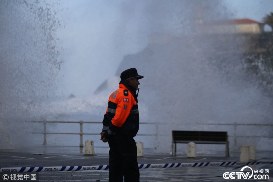 当地时间2018年1月17日,西班牙利亚内斯,当地海岸线掀起滔天巨浪。