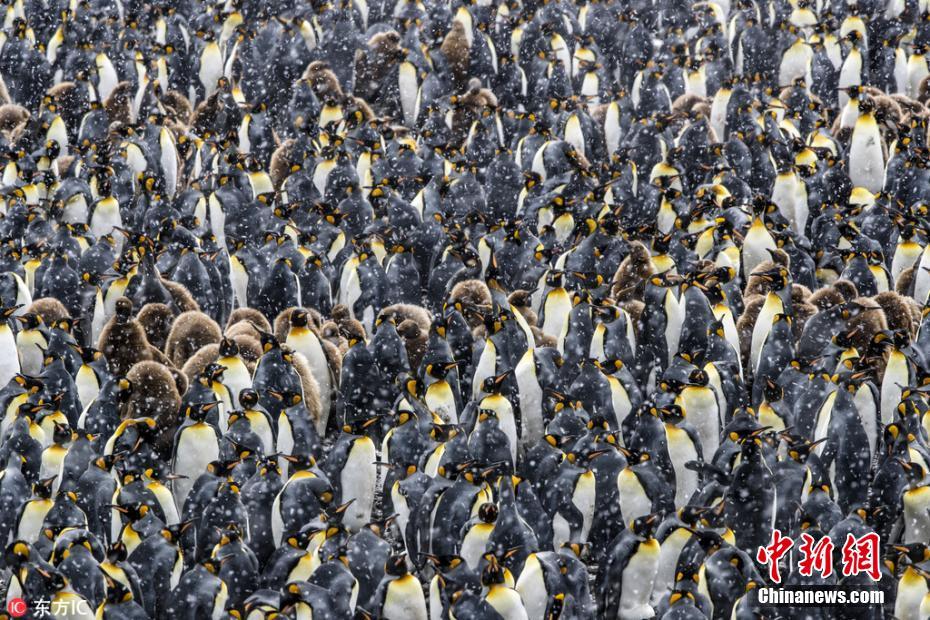 企鹅大军风雪中抱团取暖 似拼图令人眼花缭乱
