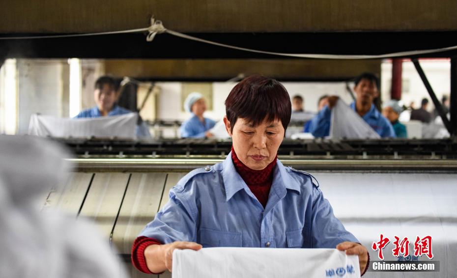 图为工人们将清洗好的潮湿卧具放在烫平机上进行高温烘烤后,折叠整齐。 图/鲍赣生 文/杨铭鸣