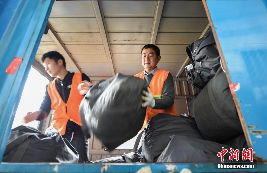 图为洗干、烘干的床单被装袋送上卡车,运送至备品车间,供春运期间列车上使用。 图/鲍赣生 文/杨铭鸣