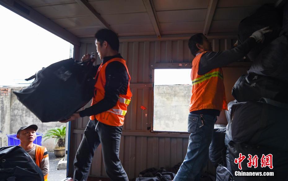 图为洗干、烘干的床单被装袋送上卡车,运送至备品车间,供春运期间列车上使用。 图/鲍赣生 文/杨铭鸣