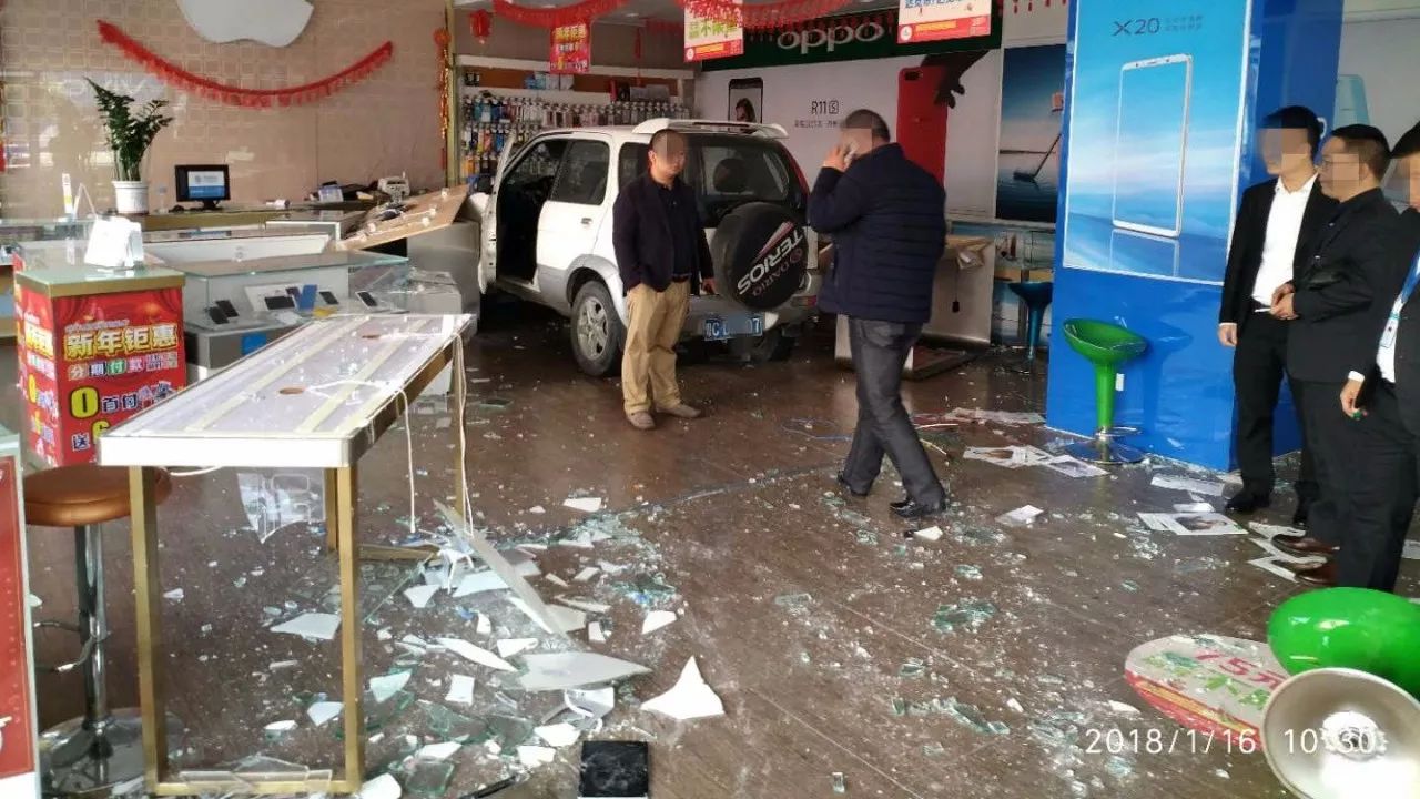 前后不到10秒钟,店里就像台风过境般一片狼藉,老板黄先生见状立即报了警。南湾交警大队钟警官迅速赶到店里,只见一辆白色达路小车停在左侧的角落里,车头深深凹陷进去,大门与手机柜的玻璃碎片铺了满地,柜子东倒西歪,各式品牌的智能手机也躺在碎片中,一时间竟找不到可以下脚之地。