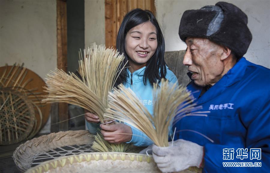 1月16日,刘青青(左)在79岁的杨其贵老人家指导他按网友要求编制竹制品。杨其贵老人在刘青青的网店上出售竹制品,年收入达6000余元。