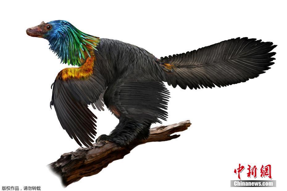 1月19日消息,英国《自然通讯》杂志日前在线发表了关于一块带毛恐龙化石的研究成果,研究团队由中国、美国、比利时科学家组成。研究者根据标本的特点,即在其中发现了和蜂鸟色素体相似的色素体,推测标本具有鲜艳的颜色,因此研究团队决定将其命名为“巨嵴彩虹龙”。图为“巨嵴彩虹龙”艺术效果图。 文字来源:北京青年报
