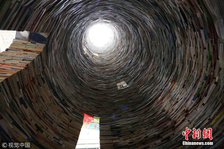 2018年1月21日消息,在西安老钢厂设计创意产业园的一个老厂房里,伫立着一座用近15吨大学教材堆成高11米、直径2.5米的书塔。设计者是一名叫赵海涛的画家,他说:“大家都把这叫‘书塔’,其实它叫‘书塌’,‘崩塌’的‘塌’。书代表着知识,知识是一种力量,但书本上的知识是苍白的,叠加得越多越容易崩塌,大学生不能困在书本中,必须走出去增长见识,增强自身的创造力。 魏永贤 摄 图片来源:视觉中国