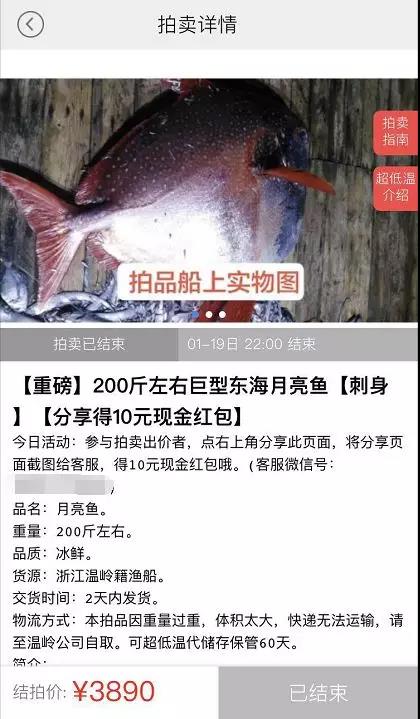专家查了相关文献资料后表示:月亮鱼是刺身的上等食材,国际市场上的售价至少是三文鱼的10倍,而且这种鱼未列入濒危目录,也就是说,只要有人买,就可以卖。据了解,月亮鱼常见于美国,在中国捕获捕获的概率低于彩票中奖。鱼还没到岸,鱼就被拍卖走了。1月19日晚上11点,月亮鱼通过鱼运船运回温岭,而此时,网络上的拍卖已经在一小时前就结束了,最终的成交价定格在3890元。