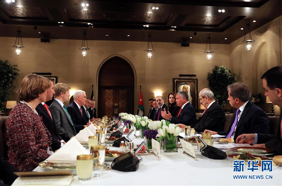1月21日,在约旦首都安曼,约旦国王阿卜杜拉二世(右四)与美国副总统彭斯(左四)会谈。约旦国王阿卜杜拉二世21日表示,期待美方能够在耶路撒冷地位问题上找到正确方向,尊重耶路撒冷的历史地位,约旦将与美方保持密切合作。新华社发(穆罕默德·阿布·古什 摄)
