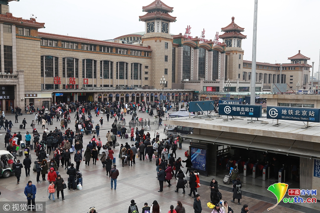 2018年1月21日,北京,2018春运将至,伴随着北京大中院校陆续放假、外来务工人员提前返乡,北京站现旅客出行小高峰,大批旅客“扎堆”出行。图片作者:栗子/视觉中国