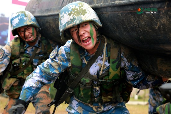 陆战队员正在进行扛舟训练。梁景锋 摄