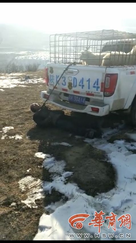 ​1月22日报道,陕西省榆林市一男子平躺在地,绳子一头系着自己的脖子,另一头拴在执法车后的防护网上,防护网里关着几只羊。原来当地封山禁牧,有村民违法放牧,眼看羊被执法人员查扣,便做出过激之举。来源:华商网