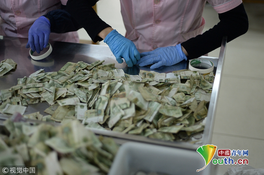 2018年1月18日,山东省济南市,公交岗位中有一个特殊工种,这就是被人们描述为“数钱数到手抽筋”的点钞员。在济南市公交总公司点款中心点钞室,这是一个嘈杂而又沉默的空间,嘈杂的是点钞的声音,沉默的是90多位点钞员。点钞中心如同一个生产车间,偌大的办公室内,堆满了大大小小的布袋和投币箱内胆。点钞中心中区设点钞台,90多位穿着粉色工作服的点钞女工神情专注,每一根手指上下翻飞,似乎都在以极限的速度运转着,整个点钞中心寂静的只能听到数钱的声音。据了解,点款中心有156名职工,点钞员是95名,点款中心分为翻袋、点钞、复点、微机四道工序,其中女职工132名。每天从公交车上收来的零币有70万左右,这些零币需要这90多位点钞员分拣清点完成,也就是说每个点钞员每天要分拣清点一万多元钱左右。以两秒一张的速度持续七个小时才能完成每天的工作量,工作压力之大可想而知。每位点钞员现在一天平均数一万三四千张纸币,最高的一次数到1万9千多张。点钞的同时还要挑出各种游戏币、假币和残缺币,并对残缺纸币进行挑选拼接。