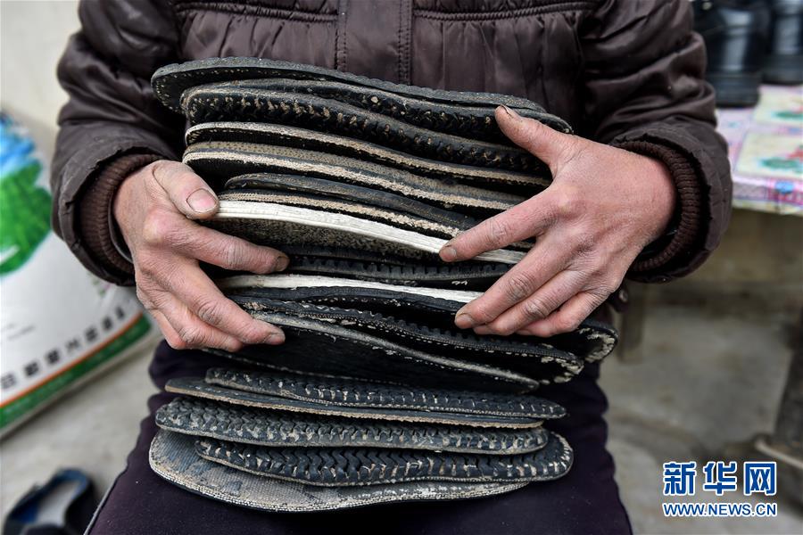 1月18日,在平顺县虹梯关乡佛堂村,杨银科的妻子杨许英在整理鞋底,准备帮杨银科做新鞋。这些年,杨银科不知道穿烂了多少双妻子做的鞋。
