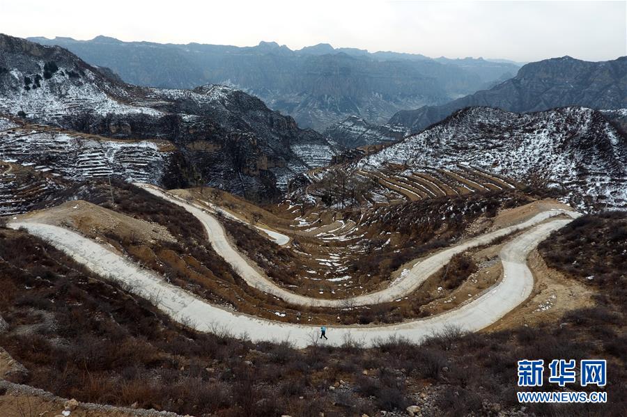 1月18日,在平顺县虹梯关乡太行山深处,杨银科背着邮包走在邮路上。