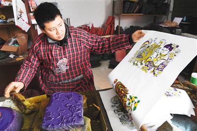 春节临近,河南省开封市朱仙镇的木版年画作坊正抓紧时间制作年画,供应节日市场。图为1月17日,年画艺人尹恩天在制作年画。 新华社记者 朱 祥摄