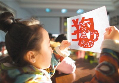 内蒙古呼和浩特市玉泉区石头巷小学学生在展示“狗年”的剪纸作品。 丁根厚摄(人民视觉)