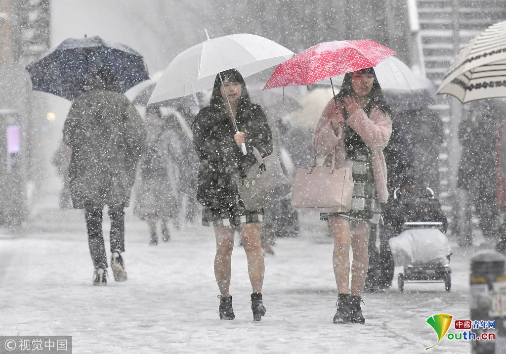 日本东京大雪交通混乱 高中女生光腿短裙雪中行